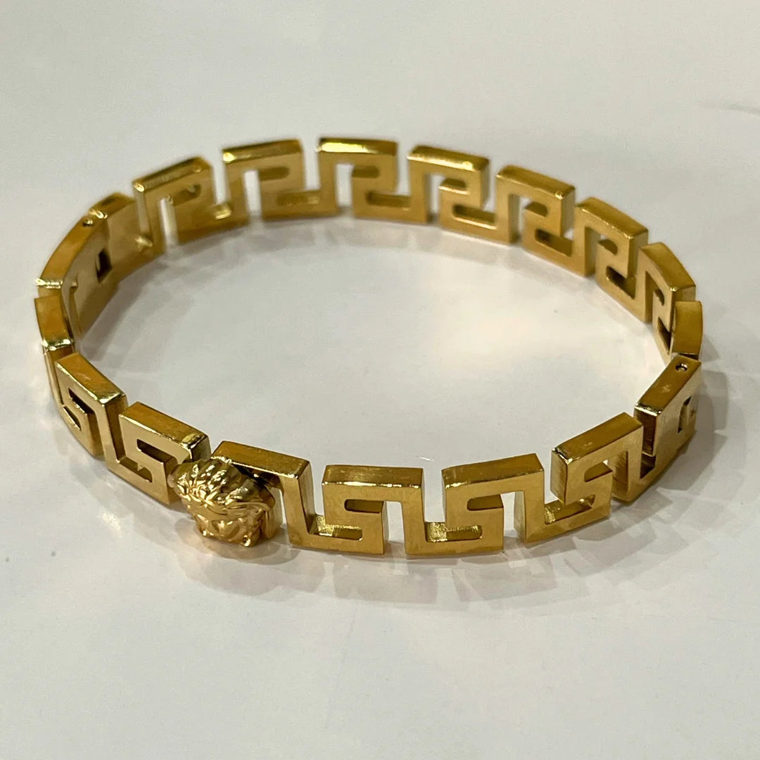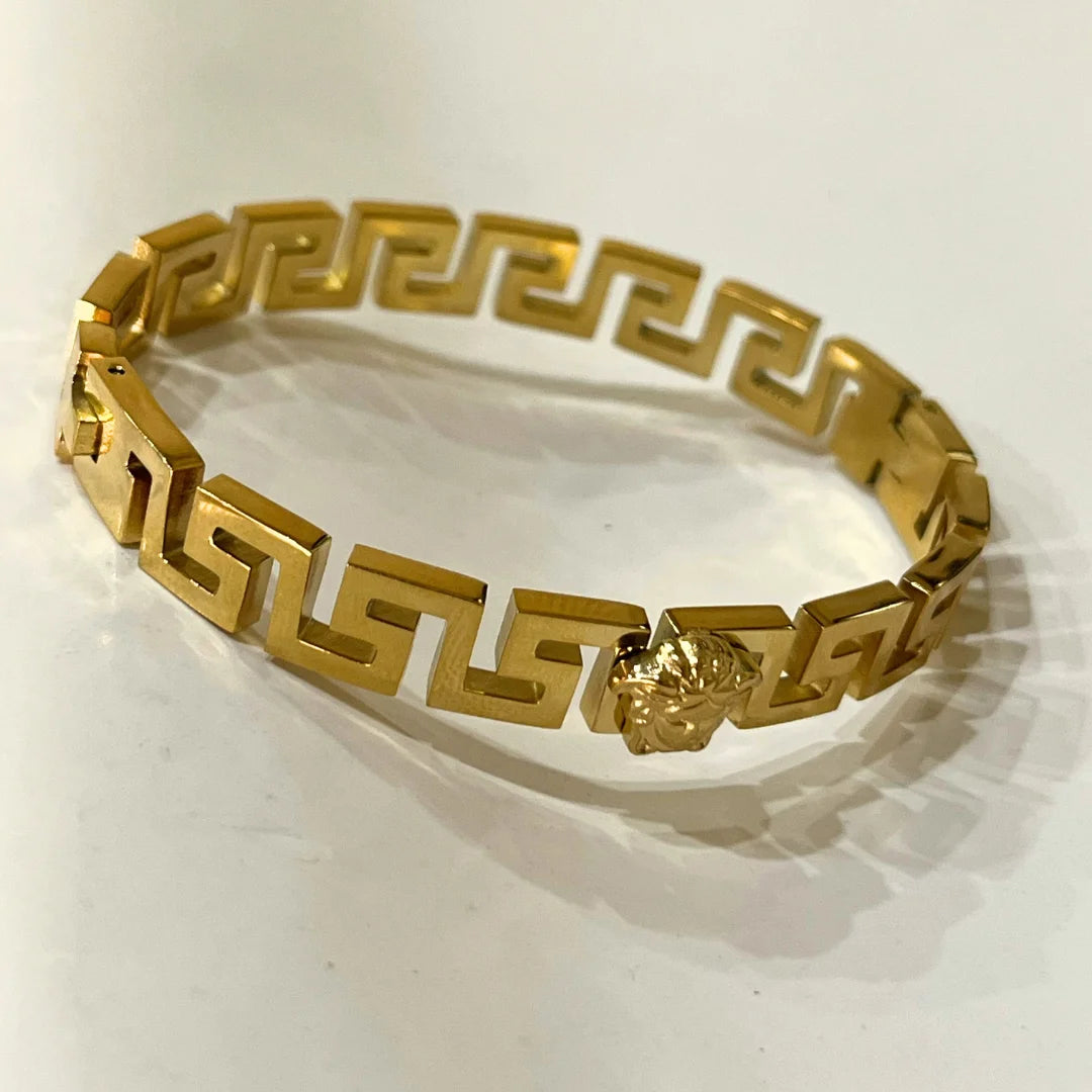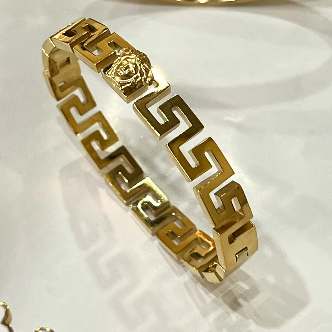 Go to the shopAdd a touch of luxury with our Greek Golden Bangle. Featuring a sleek golden finish and a timeless Greek key pattern, this elegant bangle is perfect for both daily wear and special occasions.